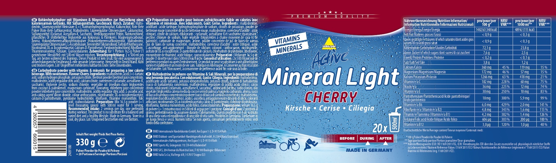 Neben Gels sind Sportgetränke eine beliebte Form der Energiezufuhr bei Ausdauersportlern. Hier können auf einfachem Wege Energie in Form von Kohlenhydraten und noch viel wichtiger Elektrolyte, die während der Belastung über den Schweiss verloren gehen, nachgefüllt werden. Das Active Mineral Light ersetzt den Wasserverlust schnell und ist insbesonders für Ausdauerbeanspruchungen geeignet. Aufgrund der speziell zusammengesetzten Kohlenhydratmatrix bist Du kurz-, mittel- und langfristig mit Energie versorgt. Kohlenhydratmatrix; Fettfrei, 9 Vitamine, 3 Mineralstoffe, kalorienarm