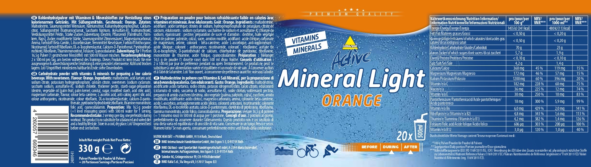Neben Gels sind Sportgetränke eine beliebte Form der Energiezufuhr bei Ausdauersportlern. Hier können auf einfachem Wege Energie in Form von Kohlenhydraten und noch viel wichtiger Elektrolyte, die während der Belastung über den Schweiss verloren gehen, nachgefüllt werden. Das Active Mineral Light ersetzt den Wasserverlust schnell und ist insbesonders für Ausdauerbeanspruchungen geeignet. Aufgrund der speziell zusammengesetzten Kohlenhydratmatrix bist Du kurz-, mittel- und langfristig mit Energie versorgt. Kohlenhydratmatrix; Fettfrei, 9 Vitamine, 3 Mineralstoffe, kalorienarm