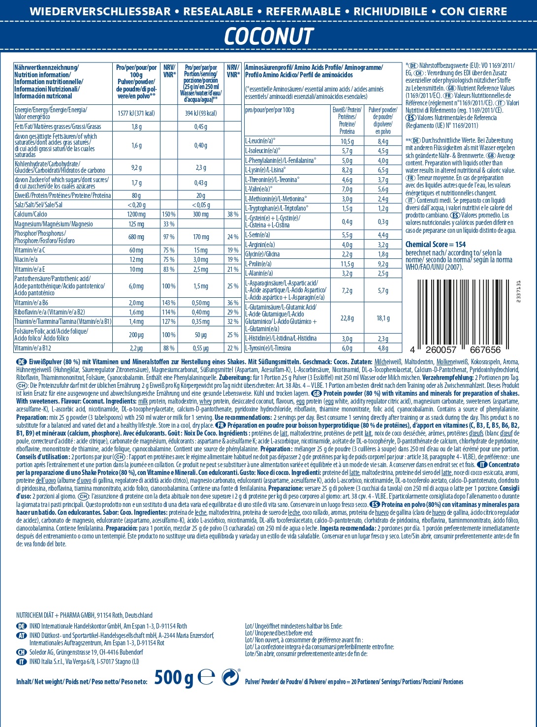 Les protéines sous leur forme la plus savoureuse ! inkospor® PRO 80® le shake aux protéines avec 80% de protéines et 100% de goût ! Expérimente à chaque gorgée dinkospor® Active PRO 80® la qualité INKO imbattable avec une onctuosité unique et des fins arômes. 80% de protéines 4 composants, jusquà 4650 mg de BCAA par portion ; sans matière grasse, sans sucre ; 9 vitamines, 3 minéraux.