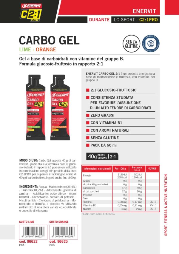 ENERVIT CARBO GEL 2:1 è un prodotto energetico a base di maltodestrine e fruttosio, con vitamine del gruppo B.