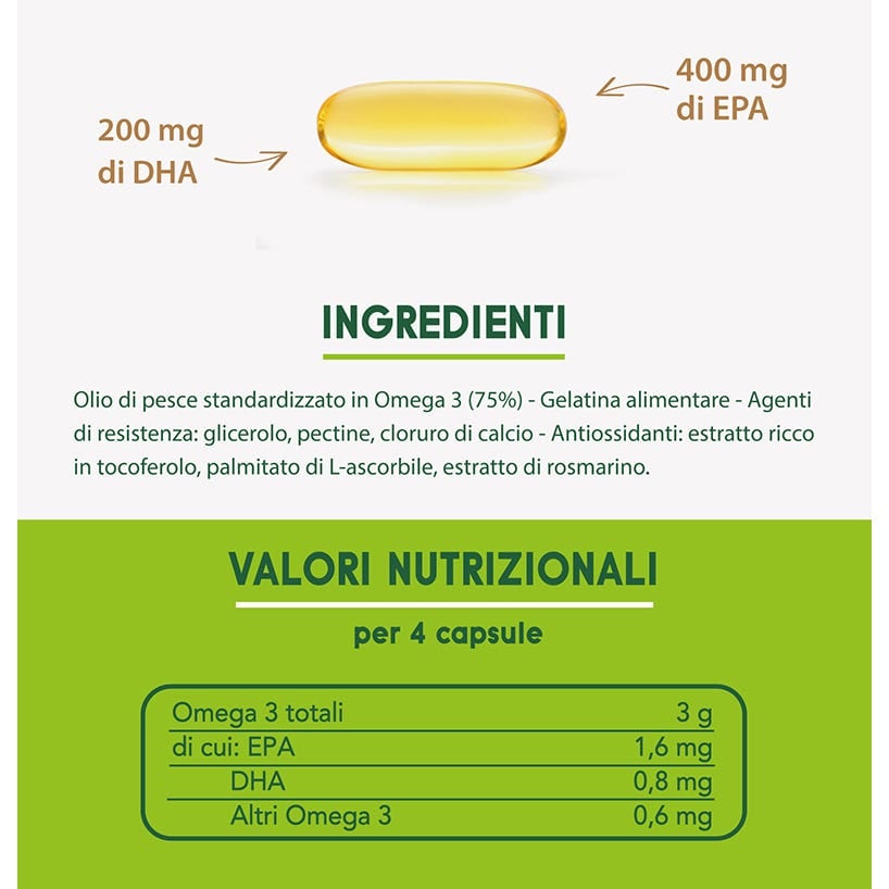 EnerZona Omega 3 RX è ottenuto per distillazione molecolare. La percentuale di acidi grassi Omega-3 EPA + DHA è del 60%, mentre la quantità totale di acidi grassi Omega-3 è del 75%. Si ottiene così la massima efficienza del prodotto. Dopo l'ingestione non c'è retrogusto di pesce. La qualità è certificata da IFOS (International Fish Oil Standard). 1 capsula contiene 400mg di EPA, 200mg di DHA e 150mg di Omega 3 aggiuntivi