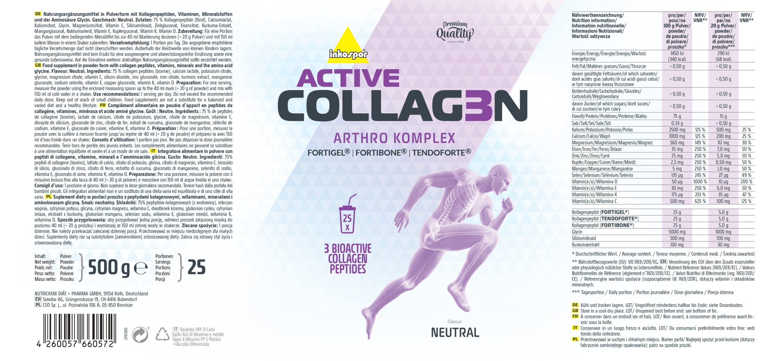 ACTIVE COLLAG3N Arthro Komplex FORTIGEL®, FORTIBONE®, TENDOFORTE® Complément alimentaire en poudre d‘apport en peptides de collagène, vitamines, minéraux et acide aminé glycine. Goût : Neutre.