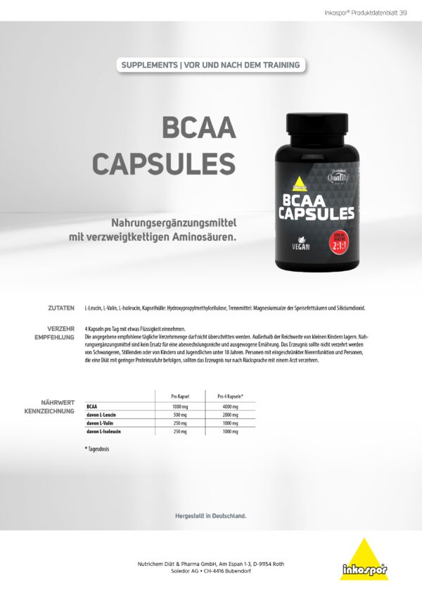 L-Leucin, L-Isoleucin und L-Valin im optimalen Verhältnis 2:1:1 Die 120 Kapseln vollgefüllt mit verzweigtkettigen Aminosäuren und Calcium warten nur auf ihren Einsatz. Und warum sie warten lassen? Mach Dich gleich auf zum Training mit den handlichen BCAAs im Gepäck!