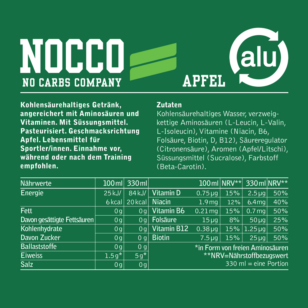 Die koffeinfreie Alternative! Der fruchtig frische Geschmack nach knackigem Apfel macht NOCCO Apple so beliebt! 100% zuckerfrei und angereichert mit sechs unterschiedlichen Vitaminen. Für alle, welche nach einem Erfrischungsgetränk mit BCAA ohne Koffeingehalt suchen.