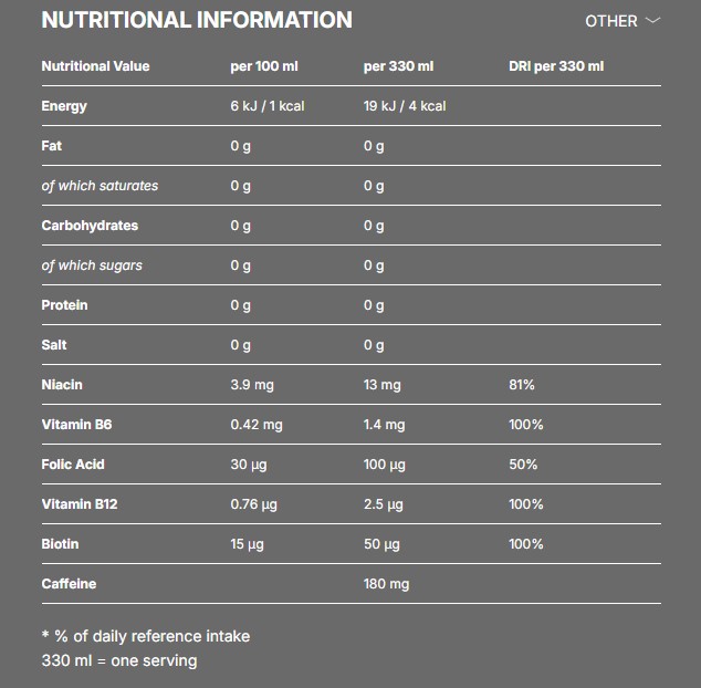 Acqua gassata, caffeina, estratto di tè verde, vitamine (niacina, B6, acido folico, biotina, B12), correttore di acidità (acido citrico), aromi, edulcorante (sucralosio), conservanti (sorbato di potassio, benzoato di sodio), colorante (carotene), concentrato di carota colorante.