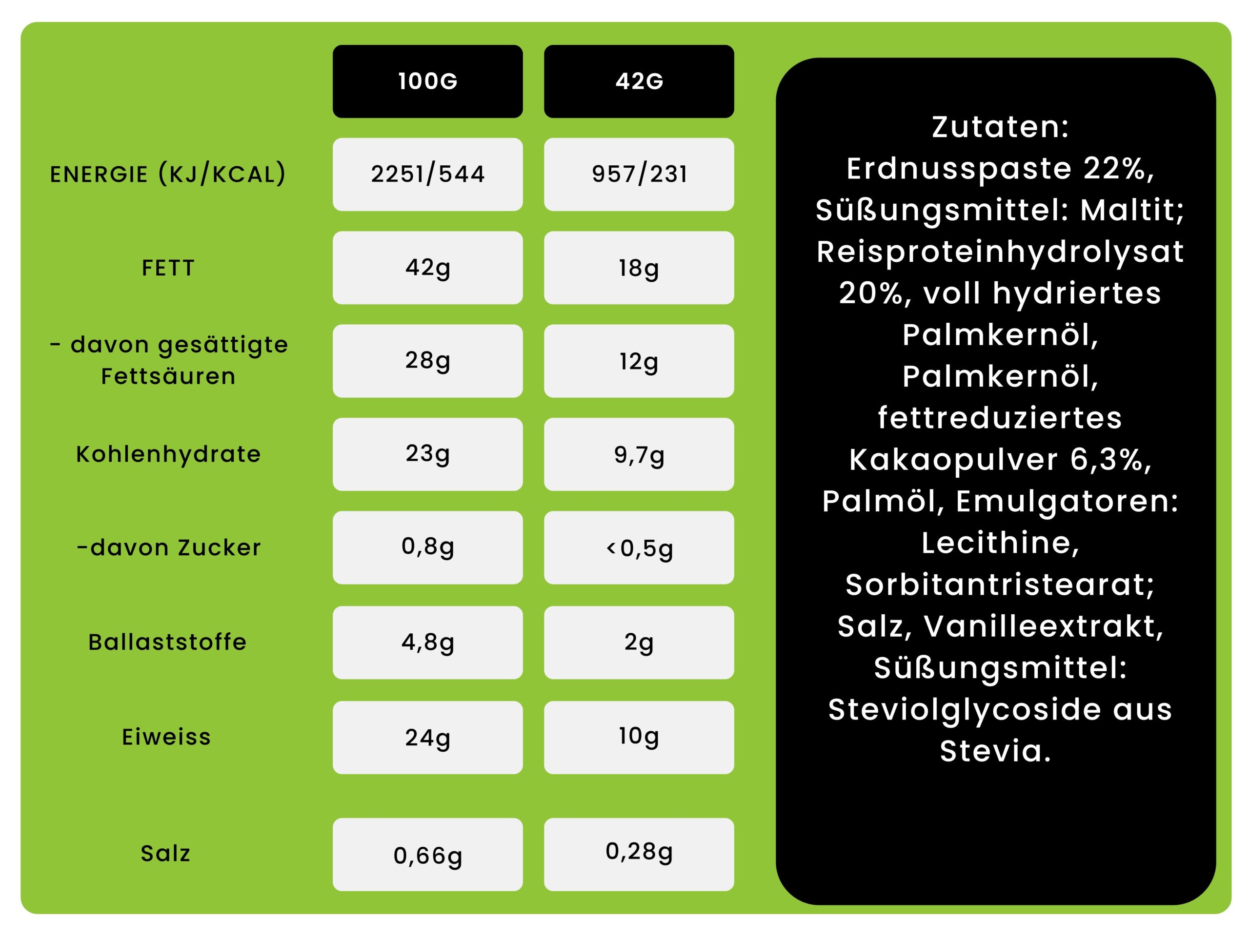 Erdnusspaste 22 %, Süßungsmittel: Maltitole; Reisproteinhydrolysat 20 %, voll hydriertes Palmkernöl, Palmkernöl, fettreduziertes Kakaopulver 6,3 %, Palmöl, Salz, Emulgatoren: Lecithine, Sorbitantristearat; Vanilleextrakt, Süßungsmittel: Steviolglycoside aus Stevia.