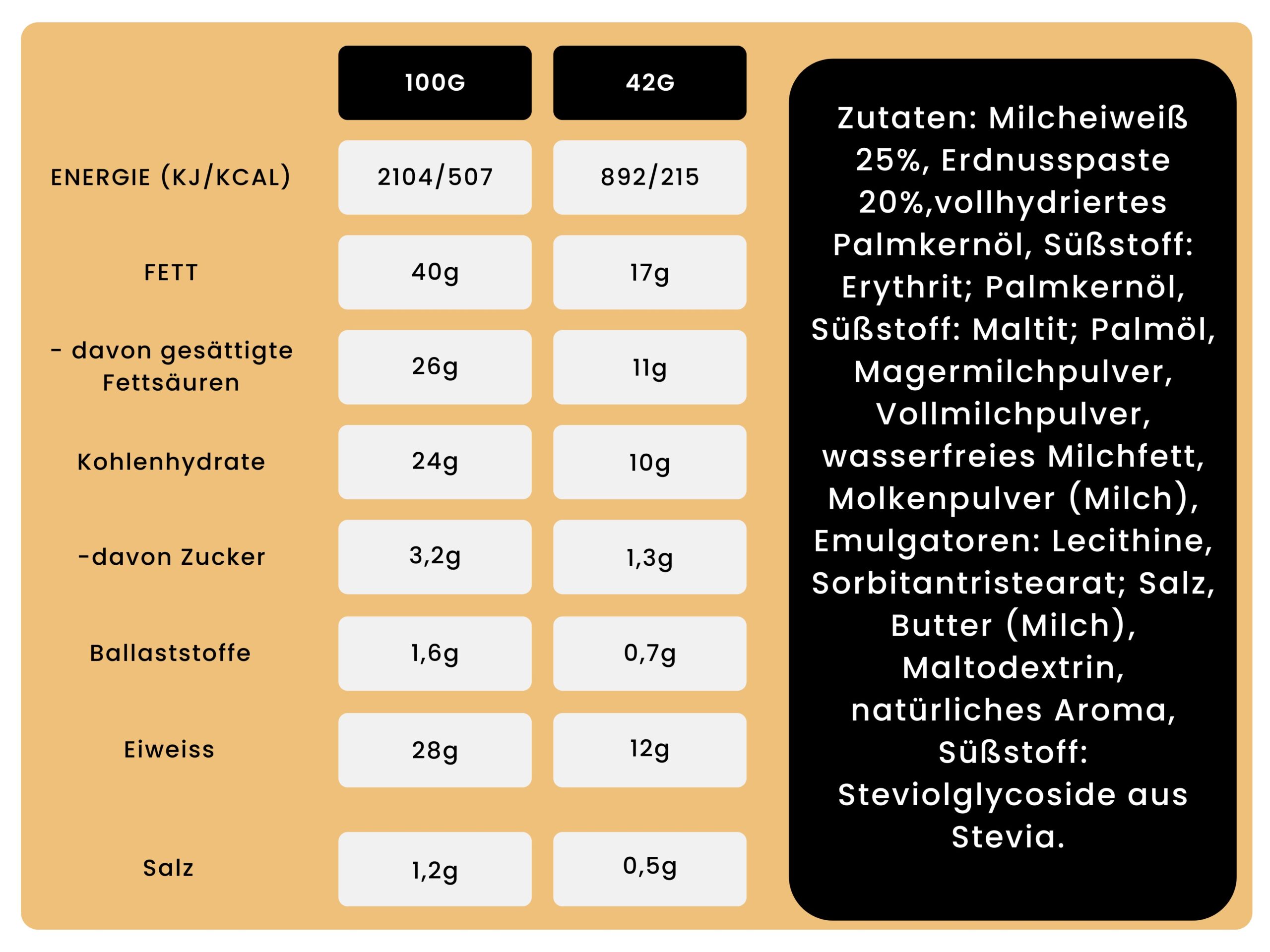 Milcheiweiß 25 %, Erdnusspaste 20 %, vollständig hydriertes Palmkernöl, Süßungsmittel: Erythrit, Maltitole, Steviolglykoside aus Stevia; Palmkernöl, Palmöl, Magermilchpulver, Vollmilchpulver, wasserfreies Milchfett, Molkenpulver (Milch), Salz, Butter (Milch), Emulgatoren: Lecithine, Sorbitantristearat; Maltodextrin, natürliches Aroma.