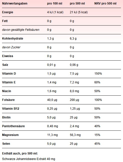 Wasser, Säureregulatoren (Citronensäure, Natriumcitrat), Vitamine (D3, E, Niacin, Folsäure, B12, Biotin, Pantothensäure), Geschmacksverstärker (Erythrit), Mineralien (Magnesium, Selen), Aromen, Extract aus Schwarzer Johannisbeere, Süssungsmittel (Acesulfam K, Sucralose), färbende Lebensmittel (Konzentrate aus Karotten und Blaubeere).