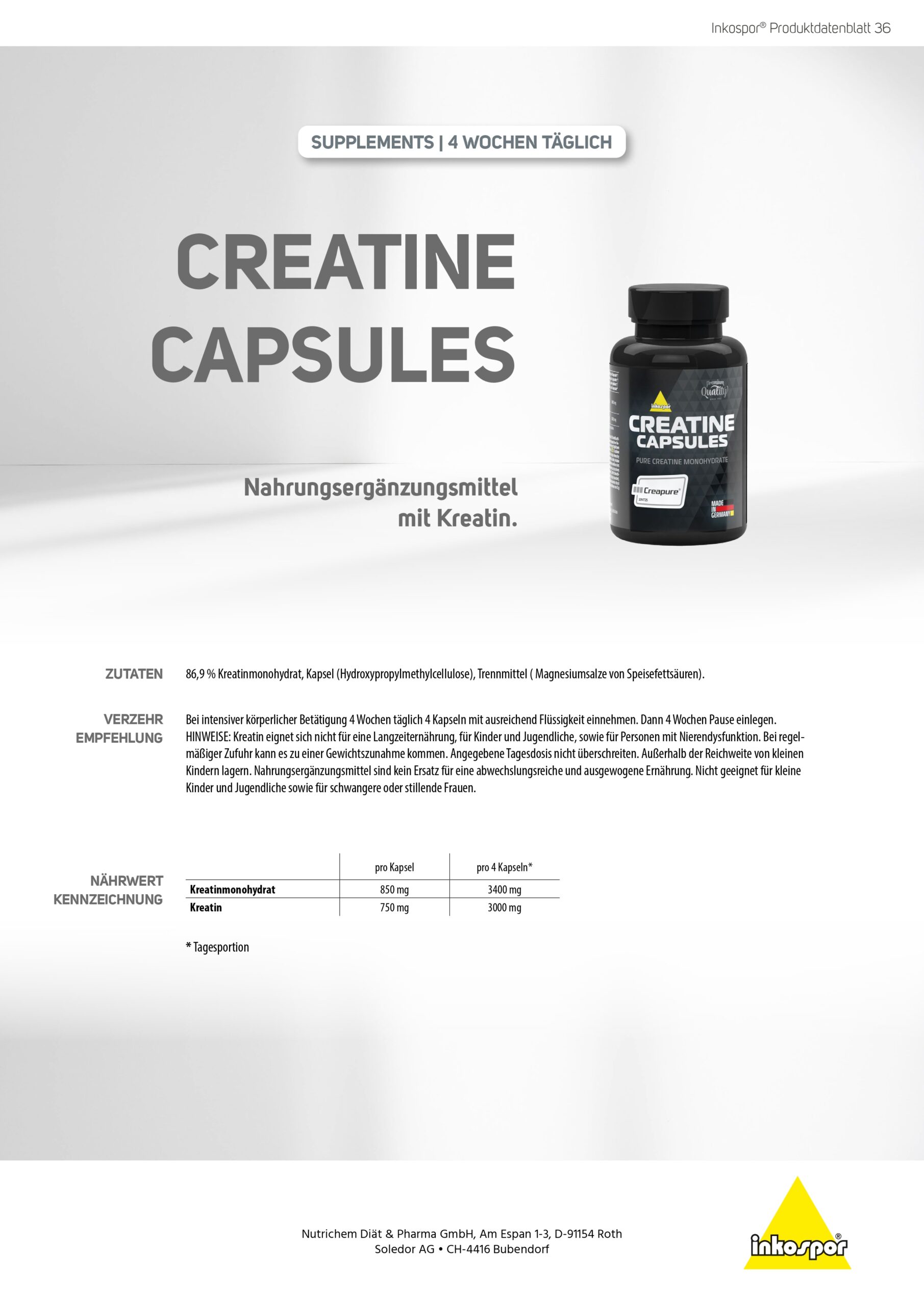 La solution pratique lors des déplacements. Capsules de 750 mg de créatine pure. Pour culturistes et athlètes de haut niveau en accompagnement dexercices de musculation in­tenses ou en cas dalimentation pauvre en créatine.